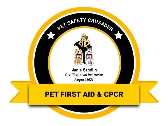 Janis holds active certifications in human Basic Life Support and CPR, Advanced Cardiac Life Support, Advanced Trauma Life Support, and now proudly teaches Pet First Aid and CPR Certification courses after completing the Sunny Dog / Pet Safety Crusader Pet First Aid & CPCR Instructor Certification Course in August 2021!